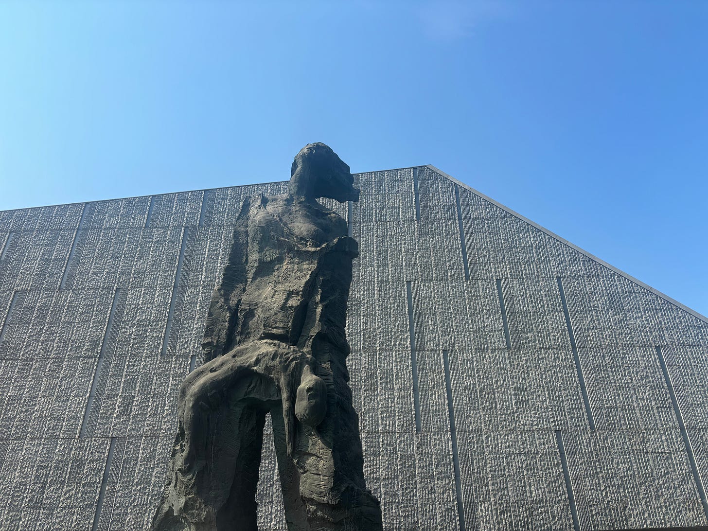 The memorial hall is part of a large complex including outdoor monuments, a chilling room of victims’ remains and an area for floral tributes. It was easily the busiest museum I have ever visited. There were long queues outside but I was the only person at the entrance for people without a Chinese ID. The main exhibition is in a large subterranean complex. Visitors descend a grand staircase into a dimly lit room lined with photographs of victims before proceeding through a detailed exhibition on the occupation, the atrocities committed by the Japanese, the subsequent relief effort and various military tribunals. The route ends with a ‘Sowing Peace’ gift shop where you can buy dove fridge magnets and purple stuffed toy flowers.