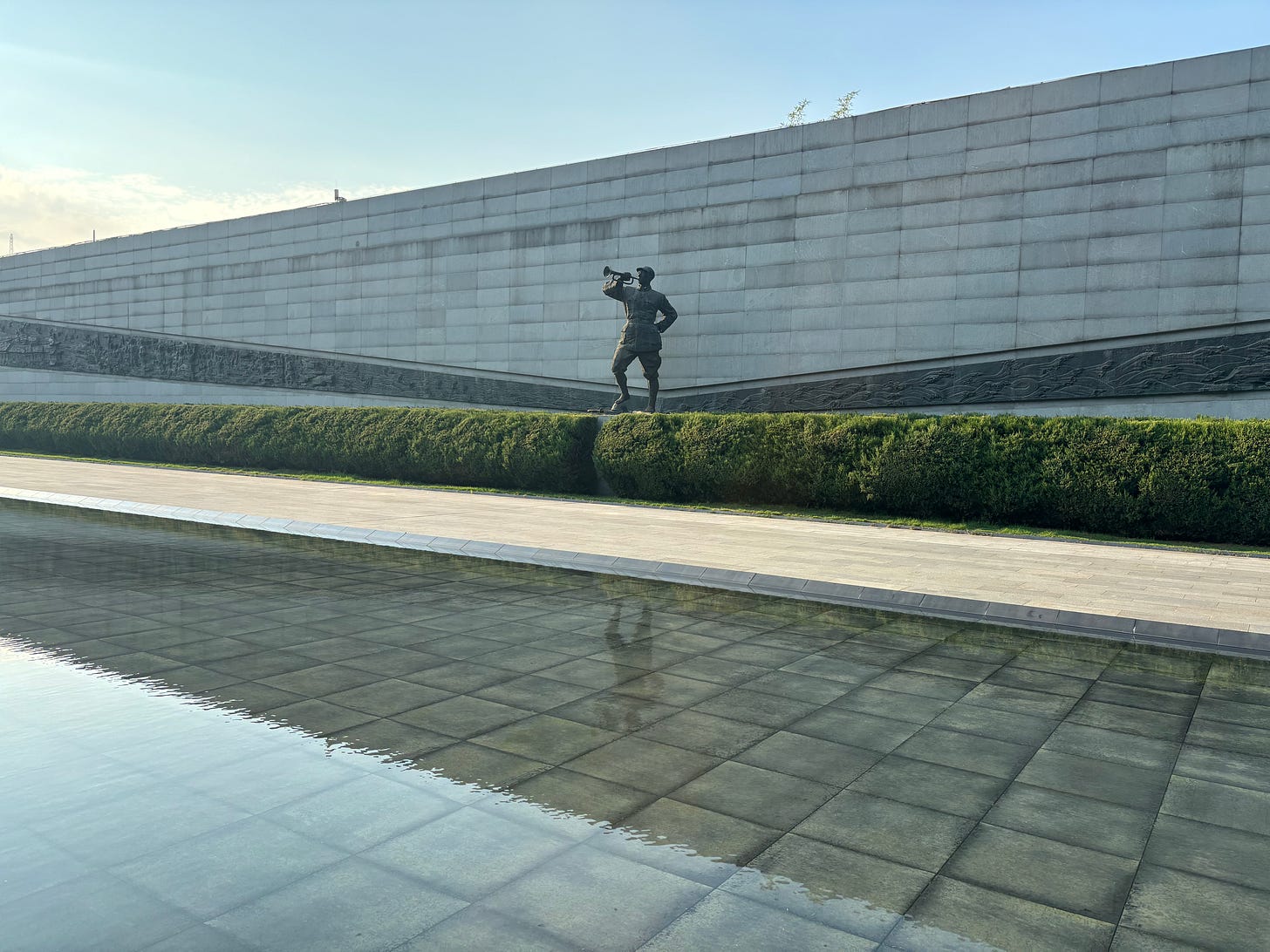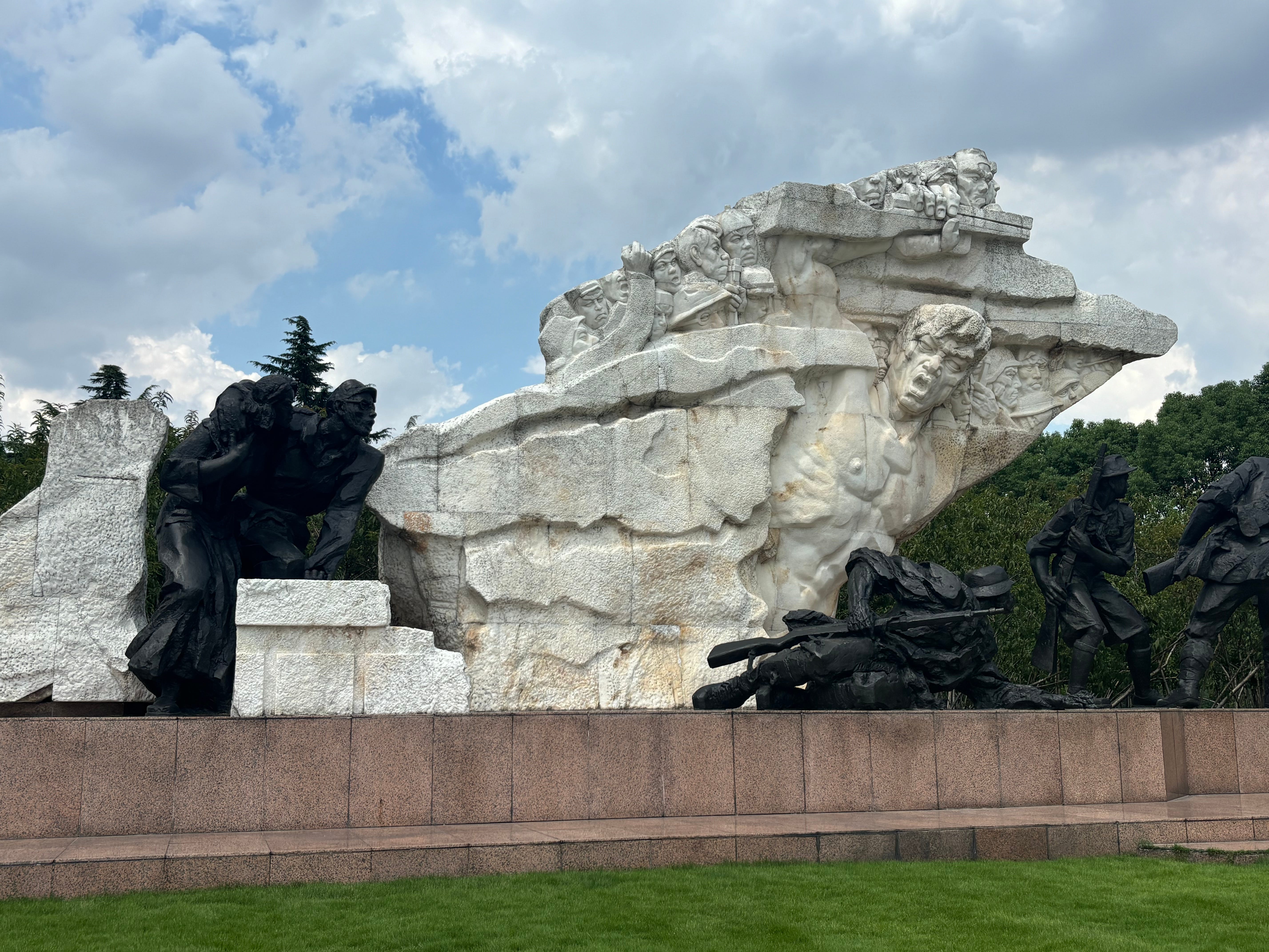 On September 3rd while the enormous military parade was taking place in Beijing, I visited the Longhua Memorial Park of Revolutionary Martyrs in Shanghai. I wandered among the trees and lily padded pools to look at the various statues and grave stones scattered across the grounds. The park is at the site of a former Kuomintang garrison where many Communists were murdered between 1927 and 1937. It includes memorials to various events. By one entrance stands a large war memorial called ‘Joint Fight Against Invasion’, commemorating military and civilian resistance to the Japanese. While I was sitting on a bench in the shade a group of young people stood in front of a central glass pyramid which houses a museum while the Internationale played from speakers poking out from the grass. After the song finished they lay flowers. It was unclear to me if this type of commemorative ritual took place regularly or if it was connected to September 3rd.