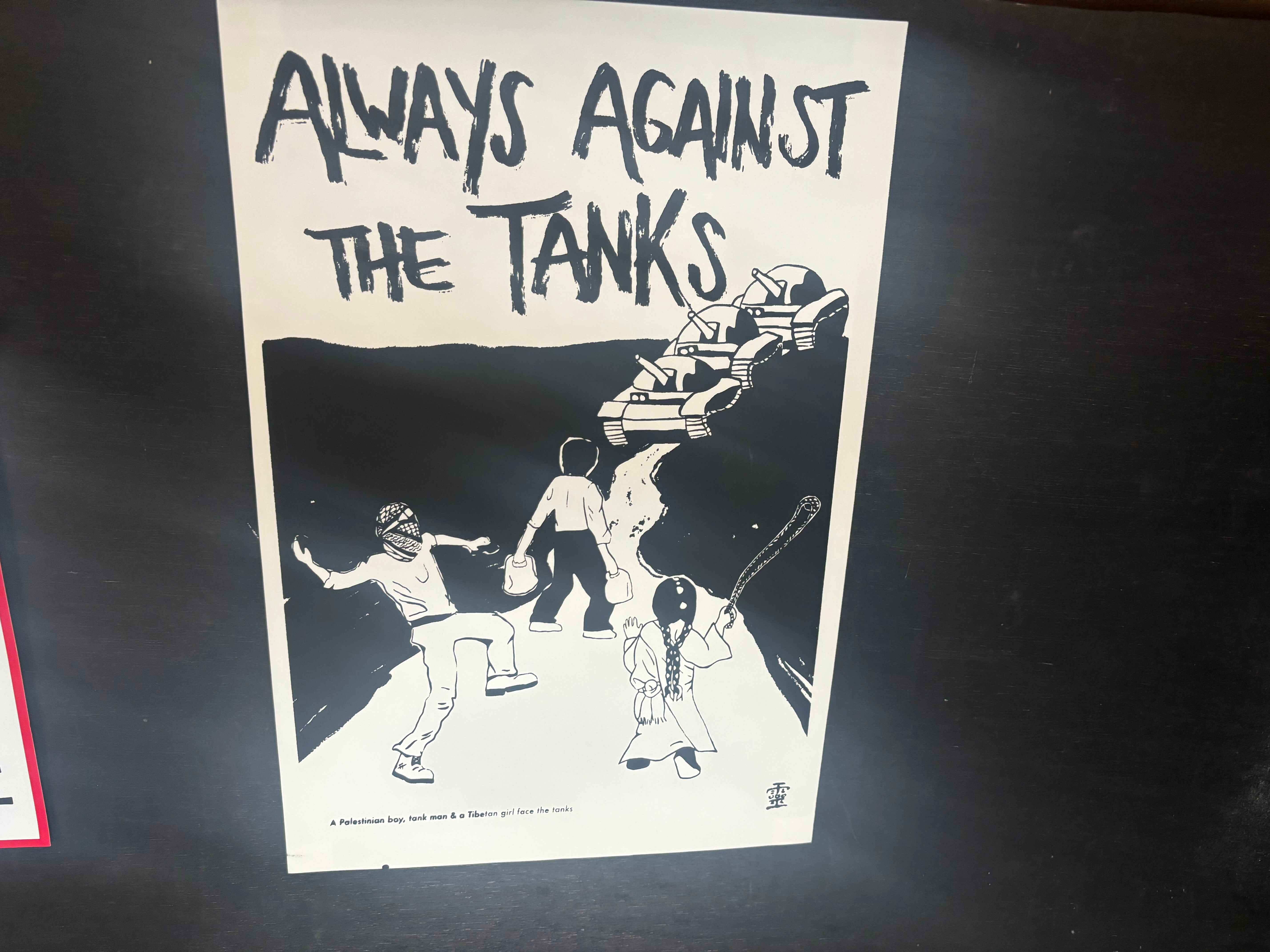 Before returning home I spent a few days in Taipei. On the morning before my flight I attended a small bake sale for Gaza at the New Bloom social centre. In contrast with the peaceful platitudes of the Sowing Peace gift shop, I saw a poster with the slogan ‘Always Against the Tanks’, which showed an image of the anonymous ‘tank man’ who stood in front of the tanks in Tiananmen Square in June 1989 alongside a Tibetan girl with a club and a Palestinian boy throwing a rock. The poster does not simply declare a commitment to peace but shows there can be no peace without resistance to unjust force.